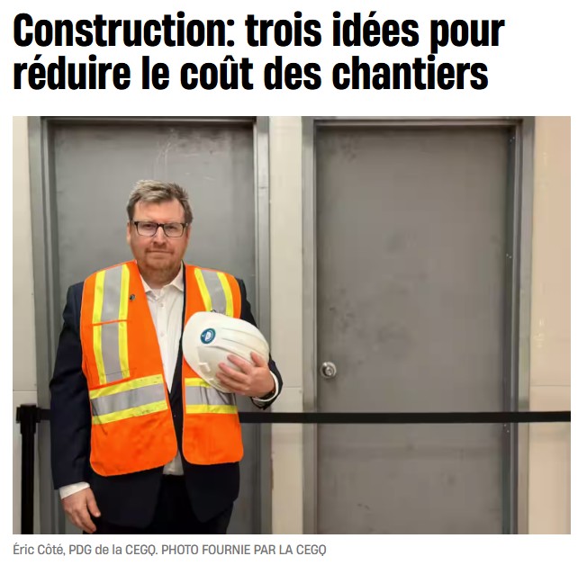 Eric Côté a partagé la vision de la CEGQ afin de réduire le coût des chantiers grâce à trois solutions efficaces : la standardisation des modèles d'infrastructures publiques, l'analyse des normes et règlements de l'industrie qui font grimper les prix et l'amélioration de la collaboration dans la conception des projets.